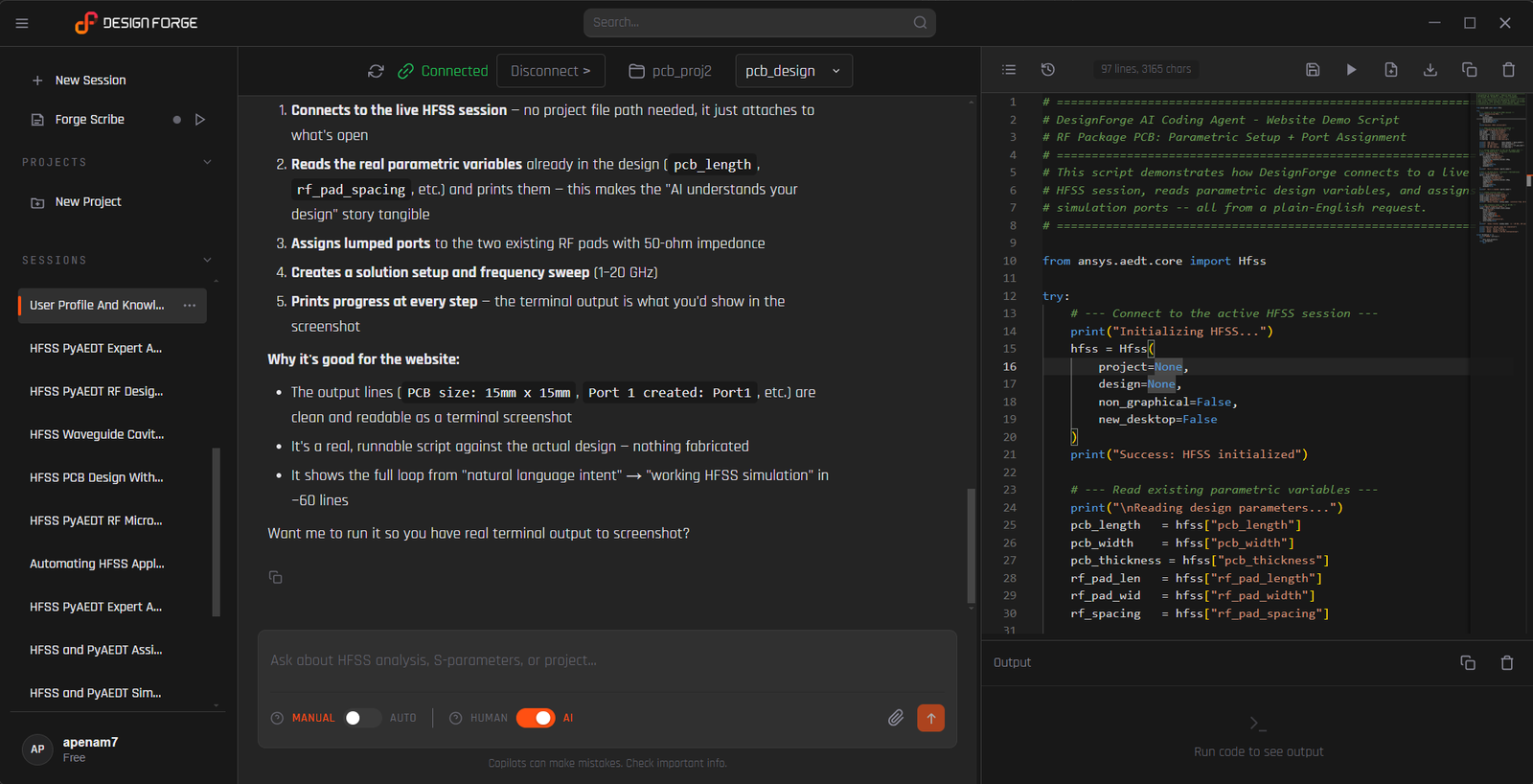 Generates and executes accurate HFSS scripts directly from engineering intent — removing the software barrier so RF engineers can focus on design, not code.